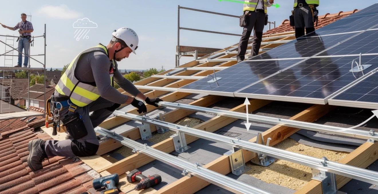 Les crochets K2 CrossHook ou les crochets Schletter Rapid2+ permettent, par exemple, de régler finement la hauteur et le déport pour éviter toute pression excessive sur les tuiles. Ils se fixent soit directement sur les chevrons/entraits de fermettes, soit sur des planches de renfort ajoutées entre deux éléments. Il est essentiel de respecter les couples de serrage préconisés par le fabricant et l’espacement maximal entre crochets, afin de garantir la tenue au vent de l’ensemble du champ photovoltaïque.